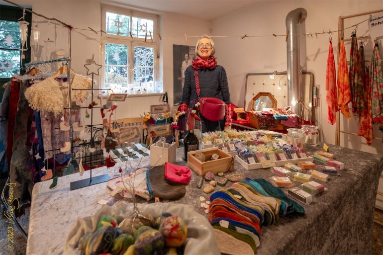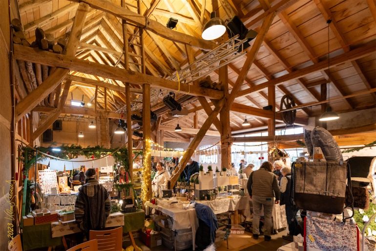 Und ist man erst einmal durch die Tür zur großen Scheune gegangen, zeigt sich die echte weihnachtliche Atmosphäre des Marktes. An liebevoll dekorierten Tischen präsentieren ausgesuchte Händler und Handwerker ihre Ware: Kreatives aus Holz, aus Papier oder aus Keramik, Dekoratives aus edlem Metall oder aus Glas, Wärmendes aus Wolle, Liköre und Pralinen, Gewürze und Duftendes… Gemeinnützige Vereine verkaufen für einen guten Zweck. Die Organisatoren des Adventsmarktes legen Wert darauf, dass keine gewerblichen Sachen angeboten werden, eine Auswahl der Händler wird Jahr für Jahr unter den Anfragen getroffen.