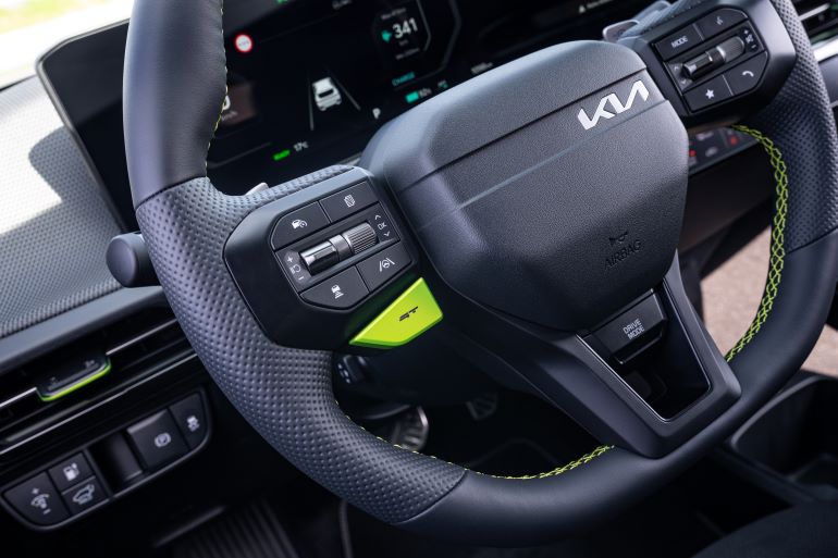 Die Optik des EV6 GT wurde auf Basis der aktuellen Kia-Designphilosophie „Opposites United“ (Vereinte Gegensätze) weiterentwickelt und geschärft. Im Kia-typischen „Tiger- gesicht“ zeigt der sportliche Crossover das neue „Star Map“-Tagfahrlicht der Marke, dessen Grafik an die Darstellung von Sternbildern angelehnt ist. Die Front wird außerdem durch ein neues flügelförmiges Stoßfängerdesign geprägt, das der hintere Stoßfänger aufgreift. Die neuen 21-Zoll-Leichtmetallfelgen verweisen ebenso wie die markanten neonfarbenen Bremssättel auf die hohe Fahrdynamik. Im Innenraum finden sich die für den EV6 GT typischen Neon-Akzente an den jetzt elektrisch einstellbaren schwarzen Sportsitzen mit Bezügen in Wildlederoptik sowie am neuen Lenkrad. Es bietet eine bessere Sicht auf das Kombiinstrument, ist ebenfalls elektrisch einstellbar und verfügt wie der Fahrersitz über eine Memory-Funktion. Optisch modifiziert wurden auch die Mittelkonsole und das Panoramadisplay mit den Bildschirmen des digitalen Kombiinstruments und des Navigationssystems. Hoher Reisekomfort, bequemes Laden, dynamisches Fahrerlebnis inklusive Driften Als moderner Grand Tourer besitzt der EV6 GT in jeder Hinsicht echte Langstreckenqualitäten. Im sportlich-luxuriösen Interieur bietet der knapp 4,70 Meter lange Crossover aufgrund seines Radstands von 2,90 Metern ähnlich großzügige Platzverhältnisse wie ein Mittelklasse-SUV. Dank der großen Reichweite und der kurzen Ladezeiten muss sich der Fahrer unterwegs über das Laden wenig Gedanken machen – zumal der Kia-EV-Routenplaner die Ladeplanung auf Wunsch automatisch erledigt, inklusive Batterie-Vorkonditionierung an kalten Tagen. Die modernen Assistenztechnologien des EV6 GT wurden in vielen Bereichen optimiert. Standard sind neben der Hands-on-Erkennung im Lenkradkranz, die den Komfort beim assistierten Fahren erhöht, die neuen 2.0-Versionen von Spurhalte- und Spurfolgeassistent, die präziser arbeiten, der Kollisionsvermeidungsassistent, der mithilfe von seitlichen Parksensoren nun auch das Einparken unterstützt, und der Remote-Parkassistent 2.0, der das ferngesteuerte Ein- und Ausparken jetzt in Längs-, Quer- und Diagonalparklücken ermöglicht. Eine weitere aber überaus sinnvolle Neuerung: Warnungen des Geschwindigkeitsassistenten lassen sich nun mit einem Tastendruck stummschalten. Auf der sehr kurzen Sonderausstattungsliste finden sich ein elektrisches Glasschiebedach und eine abnehmbare Anhängerkupplung – denn mit bis zu 1,8 Tonnen Anhängelast ist der EV6 GT auch ein perfektes Gespanngefährt.