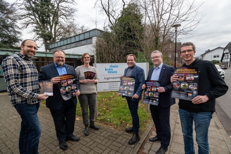 Eine bunte Mischung aus traditionellen und modernen Stücken erwartet die Kinder und ihre Familien bei der Kindertheaterreihe 2026 unter Federführung des Kreisjugendamtes in Korschenbroich, Jüchen und Rommerskirchen. Marion Klein, Leiterin des Kreisjugendamtes, präsentierte das neue Programm zusammen mit den Bürgermeistern Marc Venten, Philipp Sieben und Martin Mertens. Auch die Jugendamtsmitarbeiter Andreas Bendt und Michael Hackling waren bei dem Termin dabei. Das Kreisjugendamt ist für die drei Kommunen Korschenbroich, Jüchen und Rommerskirchen zuständig und bietet die Kindertheaterreihe bereits seit über 30 Jahren an.